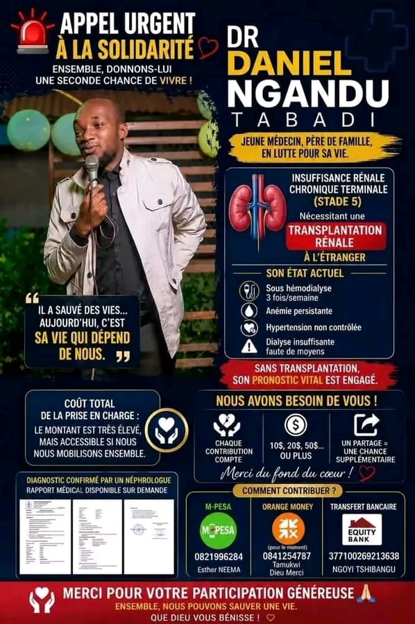 Son état de santé nécessite une transplantation rénale à l’étranger. En attendant, il est pris en charge par hémodialyse trois fois par semaine. Le Dr Ngandu présente également une anémie persistante, une hypertension non contrôlée et une dialyse rendue insuffisante par manque de moyens financiers.